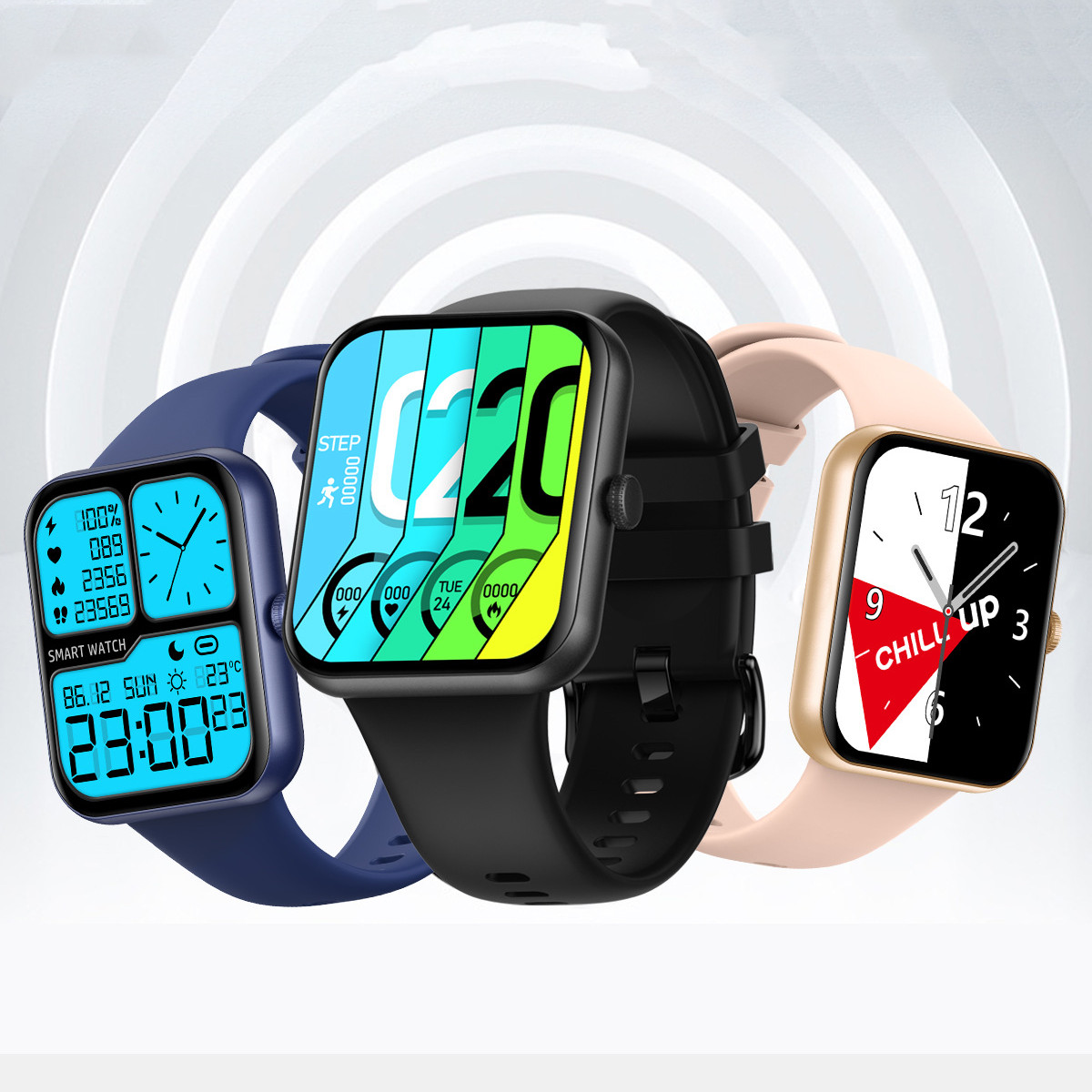 Waterproof watch with photo/selfie control, step count, heart rate, blood pressure, body temp, SpO₂, sleep tracking, Bluetooth calling, NFC, smart reminders, social features, remote control
